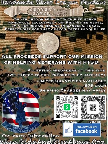 RIDE & RISE ABOVE IS SELLING HAND MADE SILVER CRAYON PENDANTS. THEY ARE MADE BY A RETIRED MARINE HERE IN BANDERA, TX. $75.00 EACH